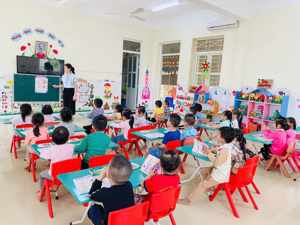 Mỗi phòng học có diện tích 55m2, vệ sinh khép kín với các thiết bị vệ sinh hiện đại, được lau dọn hàng ngày, phòng có điều hòa 2 chiều đảm bảo ấm áp về mùa đông, mát mẻ về mùa hè cho các bé. Các phòng học đều được lát sàn, có trang bị kệ, tủ và trang trí bắt mắt, cùng đồ chơi thu hút các bé theo từng độ tuổi.