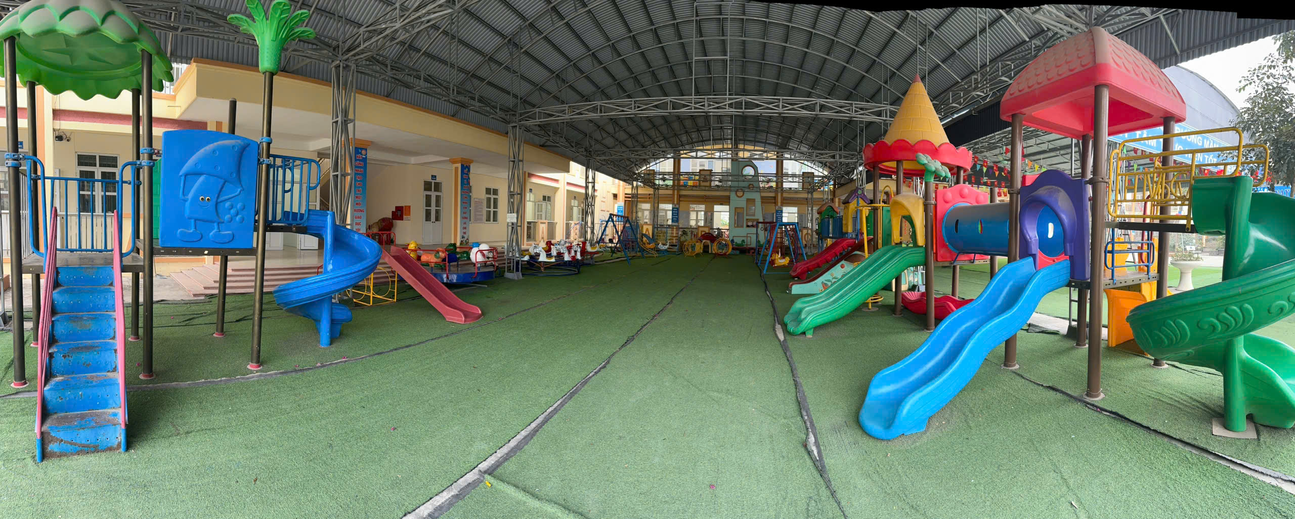 Ngoài ra, trường còn bố trí một khoảng “Vườn cổ tích” rộng rãi với sân vườn, các trang thiết bị vui chơi chắc chắn, rực rỡ sắc màu với đu quay, cầu trượt, nhà bóng và một sân đá bóng mini ngoài trời.